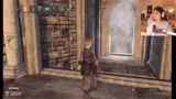 01:03:52Nach dem Verlassen des Startbereichs betritt der Streamer das erste offene Gebiet. Er beschreibt die langsame, träge Bewegung der Spielfigur und die schwache Haltbarkeit des anfänglichen Dolches. Es wird ein Kampf gegen mehrere Gegner gezeigt, bei dem der Streamer taktisch vorgeht: Er zieht Gegner einzeln an, führt nur kurze Angriffsserien aus, um Ausdauer zu sparen, und nutzt Lebenssteine zur Heilung. Er warnt vor einem spezifischen Mechanikfehler, da in Dark Souls 2 keine Invincibility Frames (I-Frames) existieren, wenn man durch Türen oder Nebeltore geht, was zu unvorhergesehenen Treffern führen kann.