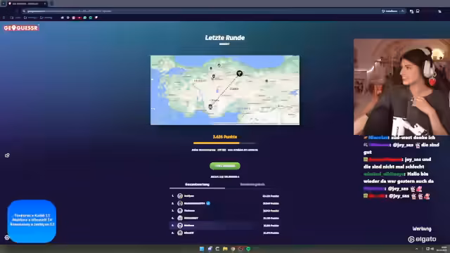 01:11:59Im GeoGuessr-Modus sollen zehn Runden mit je zwei Minuten Zeit absolviert werden. Die Teilnehmer müssen anhand von Straßenschildern, Vegetation oder Architektur erraten, wo sie sich weltweit befinden. Die Punkte werden nach Rang vergeben: Der Letzte bekommt einen Punkt, der Erste sechs. Der Streamer diskutiert Strategien wie das Aufteilen in Voice-Channels und das Erraten von Ländern wie Spanien, Argentinien und Japan, was zu spannenden Vergleichen und Fehleinschätzungen führt.