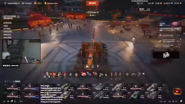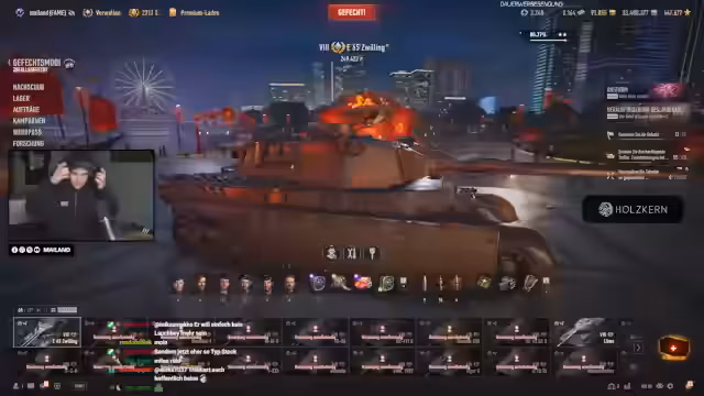 00:26:46Für die Ansturmaufgaben wird die Grille ausgewählt und ein Gefecht auf der Stadtkarte gestartet. Ein strategischer Fehler des Teams wird hierbei deutlich, als sich vier Panzer in eine unvorteilhafte Position im Norden bewegen und einen Shootout verlieren. Ein weiterer folgenschwerer Fehler ist der Verlust des Spähers, was dazu führt, dass gegnerische TDs nicht gespottet werden und die eigenen Panzer im Feuer liegen. Trotz 8.000 Schaden des Streamers endet das Gefecht in einer Niederlage, was auf ein fehlkalkuliertes Teamplay zurückzuführen ist.