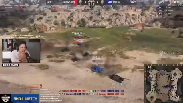 04:03:24Ein Showmatch zwischen dem EU-Team und einem asiatischen Team wird vor dem World of Tanks Championship Finale gezeigt. Das erste Match wird im EBR-Format mit nur einer HE-Granate pro Panzer ausgetragen und endet mit einem klaren Sieg für das EU-Team. Im Anschluss wird ein innovatives 1-vs-1-Format eingeführt, bei dem die Teams abwechselnd einen Spieler in den Ring schicken. Dieses Format wird als unterhaltsam und taktisch gelobt.