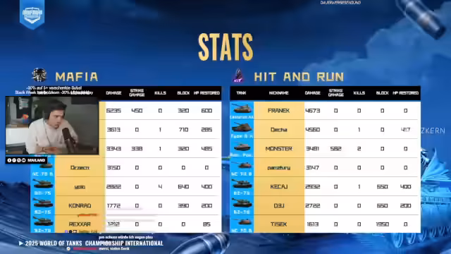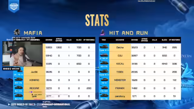 Bei der World of Tanks Weltmeisterschaft wurde über das Grand Final zwischen den Teams Hit & Run und Mafia berichtet. Obwohl Hit & Run als Favorit galt, gelang es dem europäischen Team, mit beeindruckendem Comeback und starkem Teamplay das Finale für sich zu entscheiden und den Titel zu holen.
