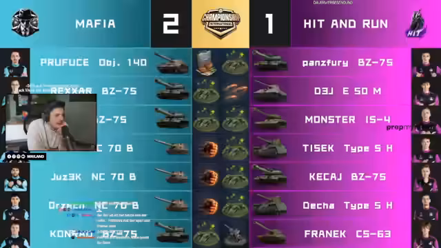 07:55:01Der finale Tiebreak auf Pilsen beginnt mit einem kalkulierten Risiko von Hit'n Run, die auf Triple-Foch-B setzen. Mafia hingegen setzt auf ihre bewährten Blitz-Panzer und mobilisiert durch die Mitte. Trotz des klugen Einsatzes von zwei Type 5 als Türwächtern und mobilen Kontern gelingt es Mafia, einen Foch-B zu blockieren und den anderen direkt nach dem Auftauchen zu eliminieren und den Sieg einzufahren.