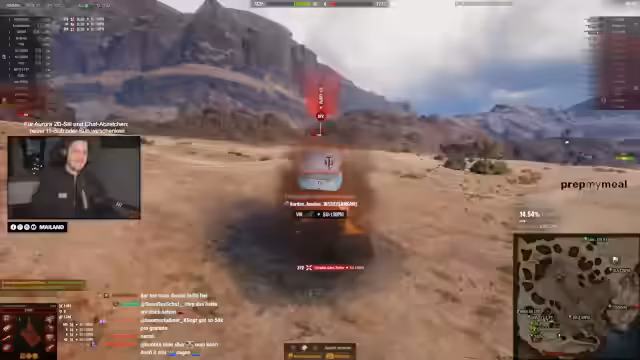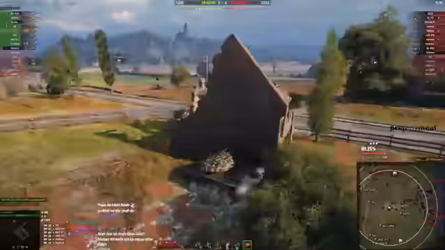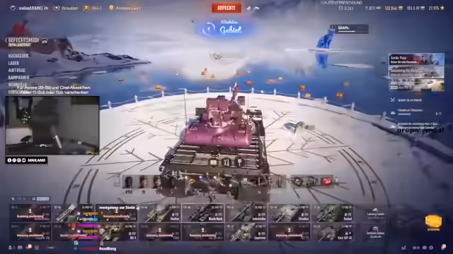 01:34:27Ein Gegner wird beobachtet und als gekauft bezeichnet, während der Spieler einen Stritzugsamme auslöscht und die Brutalität des Blesks hervorhebt. Es folgt eine technische Diskussion über Proxyspotting: Ein Gegner wird nicht gespottet, da er unter Wasser war, und der Radius wird als Zylinder mit 50 Metern Durchmesser diskutiert. Upgrades des Panzers werden geprüft, aber ein Bug im XP-System wird bemängelt, da trotz ausreichender XP kein Upgrade möglich ist. Der Spieler beschließt, eine weitere Runde zu fahren und Proxy-Spotting auf Gletscher zu erklären.