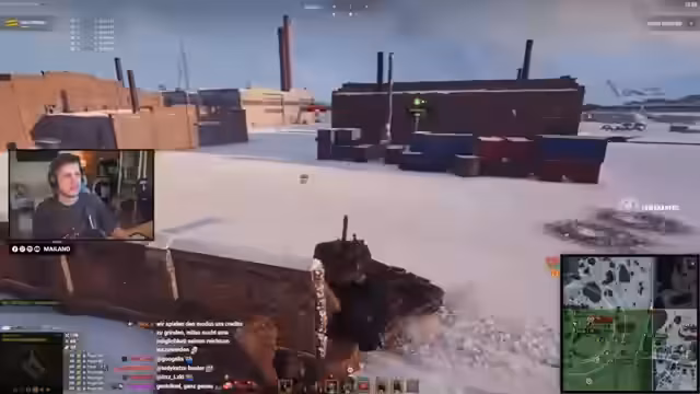 01:21:52Der Streamer beginnt eine Runde im Frontline-Modus und bewegt sich vorsichtig über die Karte. Er beobachtet gegnerische Flugzeuge und ist bestrebt, von einer exponierten Position in eine sicherere Deckung zu gelangen. Gleichzeitig beschäftigt er sich mit dem Spielmechanismus der Minen, die er als strategisches Element nutzt, und analysiert die Performance seiner sowie gegnerischer Fahrzeuge, insbesondere ihre Lärm- und Abgaswerte, die die Taktik beeinflussen.