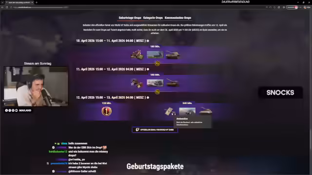 01:25:05Die World of Tanks Birthday-Drops starten in wenigen Minuten und laufen auf mehreren Kanälen parallel. Der offizielle World of Tanks Twitch-Kanal bietet exklusive Drops, um Zuschauer anzuziehen. Es gibt verschiedene Kategorien von Drops: Kategorie-Drops mit 2D-Stilen und Reserven am Montag, Kommandanten-Drops mit Geburtstags-Skins ab dem 15. April und Sonntag-Drops, die Premium-Spielzeit, Ausbausätze, eine Tiger-Maus und einen EBR 3D-Stil enthalten. Der Streamer empfindet das System als etwas unübersichtlich und kompliziert.