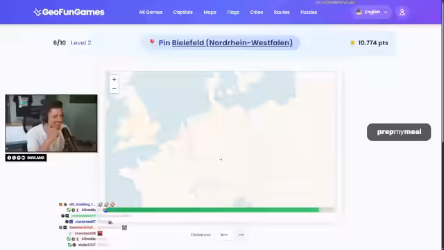 00:18:06Nach einleitenden Bemerkungen startet der Streamer ein deutsches Städtequiz im GeoGuessr-Stil. Bei dem Versuch, Städte wie Frankfurt, Berlin und Bonn auf einer Karte zu platzieren, gibt er mehrere Fehlalarme und scheitert an der korrekten Einordnung, besonders bei den Bundesländern. Er erkennt an, dass das Zuordnen von Städten in der eigenen Umgebung relativ einfach ist, während dies bei entfernten Regionen ohne spezifisches Vorwissen oder beruflichen Bezug sehr schwierig ist. Er stellt fest, dass es für ihn ausreicht, wenn er das Bundesland einer Stadt kennt.