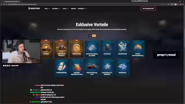 00:04:17Der Stream beginnt mit der Ankündigung neuer Inhalte für World of Tanks Plus. Pro-Abonnenten erhalten einen neuen Pass, der mehr Credits und EP spendiert. Es wird zudem ein neuer Battle Pass Plus vorgestellt, der zusätzliche Belohnungen bietet. Diese Features sollen mit dem Update 2.2 eingeführt werden und sind ein klares Vorbild aus War Thunder, was im Stream kritisch gesehen wird. Der Streamer äußert, dass diese Anpassungen, wie die Aktivitätsbelohnungen und der Zubehörassistent, nicht wirklich neu sind und Wargaming bekannte Konzepte nur wiederholt.