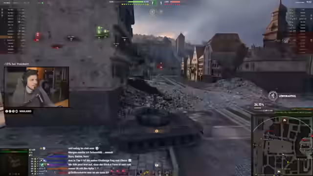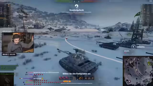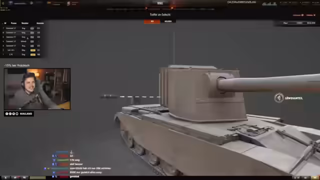 00:14:49Der Stream wechselt zum Gameplay, bei dem der Streamer auf einem F2P-Account verschiedene Panzer fährt. Im Chat werden Supporter und Followern für ihre Beiträge gedankt. Während des Spielens wird auf aktuelle Missionen und neue Lootboxen eingegangen, die im Rahmen des anstehenden St. Patrick's Days erscheinen werden. Das Gameplay wird von häufigen und teils frustrierenden Teamzusammenhaltproblemen geprägt, bei denen Mitspieler auf der Minimap nicht reagieren oder in schlechte Positionen fahren.