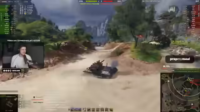 03:29:44Der Fokus liegt auf dem Hirschkäfer, einem Fahrzeug mit einem besonderen Gimmick: Er garantiert einen Blow-Up, wenn er durch ein Low-HP-Ziel schießt. Der Streamer beschreibt, wie er einen Gegner anvisiert, aber aufgrund eines schlechten Ziels (ähnlich einem Problem mit der Ausrüstung) verfehlt. Er ist in einer schlechten Position und nutzt die Zeit, um zu laden, während er auf gegnerische Aktionen wartet.