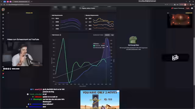 01:58:05Während des Spiels werden verschiedene Fahrzeuge wie der ASXX und die Ratte intensiv analysiert. Der Streamer beschreibt seine taktischen Herausforderungen, wie z.B. das Schwierigkeitsgrad, einen gespotteten Gegner anzugreifen, oder die Ineffektivität von Teamkollegen, die in schlechten Positionen verharren. Es kommt zu langen, hitzigen Auseinandersetzungen und kritischen Meinungsverschiedenheiten über Spielentscheidungen innerhalb des eigenen Teams.