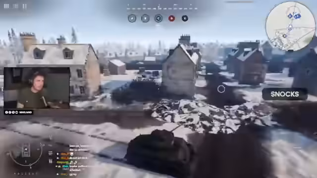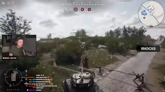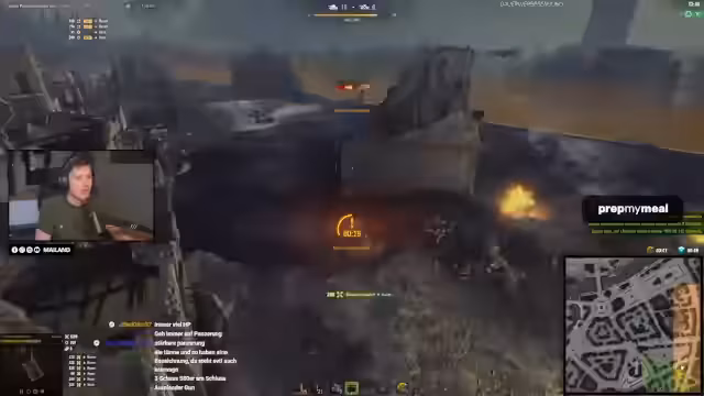 03:11:13Nachdem der Spähtrupp des Streamers unter feindlichem Feuer geraten ist, positioniert er seinen Sherman-Panzer, um seine Truppen zu decken. Er entscheidet sich gegen ein direktes Einfahren ins feindliche Gebiet und stattdessen für einen Flankenangriff. Er wechselt in die Panzer-Perspektive, nutzt das Periskop zur besseren Übersicht und gibt den Befehl, HE-Geschosse auf feindliche Gebäude zu feuern, um eine bessere Position für den Sturm zu schaffen.