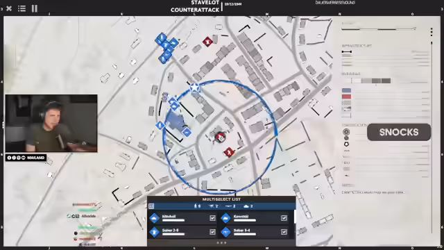 04:45:53Der Streamer beginnt eine Runde des Spiels Sherman Commander und übernimmt das Kommando über seine Truppen. Die Mission beinhaltet, bestimmte Punkte in einer Stadt zu halten und zu verteidigen. Der Streamer analysiert die Lage, stellt die Verteidigung seiner Einheiten auf die Punkte B und D ein, ist sich aber unsicher über die optimale Vorgehensweise. Er entscheidet sich, defensiv zu agieren, was sich jedoch als etwas zu passiv erweist, und muss einem feindlichen Panzer ausweichen, der seine Position bedroht.