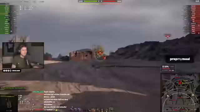 00:10:14Nach einer kurzen Einloggphase startet der eigentliche Stream mit dem Test des Sherman Commanders im Modus 'Stehlenjäger'. Mailand zeigt sich zunächst vorsichtig, da er befürchtet, dass der Panzer noch verpackt sei, wie am Tag zuvor. Er beginnt den Test mit dem Standard-Aufbau und versucht, sich mit den Eigenschaften des Panzers und dem Spielmodus vertraut zu machen, der als eine Art Battle-Modus beschrieben wird.
