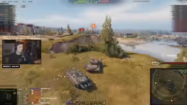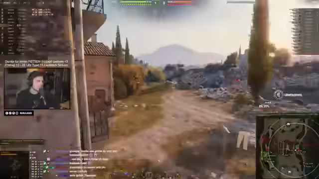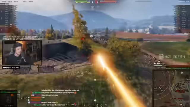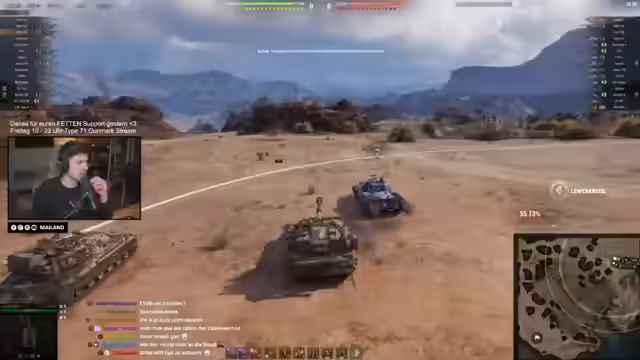 01:59:56Der Stream startet mit einem fröhlichen Kommentar zur verbesserten Stimmung im Spiel. Der Streamer kritisiert einen Mitspieler wegen eines Missverständnisses bei der Panzer-Klassifizierung, meint aber scherzend, nicht böse zu sein. Die anfängliche Euphorie wechselt schnell zu Frustration über einen Fehlschuss. Es folgen taktische Überlegungen zur Positionierung, wobei der Streamer sich über einen unglücklich überlebenden Gegner ärgert und seine eigene Leistung als nicht zufriedenstellend bezeichnet. Die Runde endet mit einem Pech, als der Streamer einen gegnerischen Panzer zwar blendet, dieser aber mit nur 11 HP überlebt und das Gefecht für sein Team trägt.