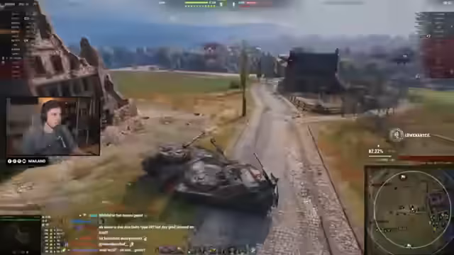 00:22:31Nach dem ersten Einstieg ins Spiel werden die ersten Gefechte auf Tier 8 und Tier 10 gespielt. Der Streamer stellt fest, dass das Rollenverteilungs-Feature des neuen Matchmaking bereits deutlich sichtbar ist. Viele Matches weisen eine ausgeglichene Verteilung von Heavys, Mediums und TDs auf. Beobachtet werden jedoch auch noch untypische Konstellationen, wie Matches mit mehr als fünf TDs oder als sehr unangenehm empfundene Premium-Panzer, die auf gleiche Stufen gematcht werden.