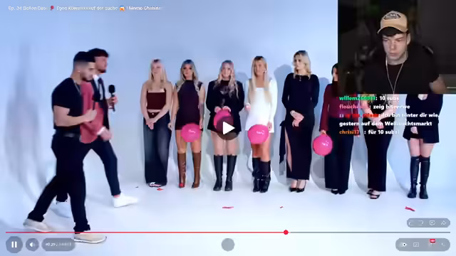 00:39:22Der Streamer ruft die Zuschauer erneut auf, ihre Talente in den Discord zu schicken, von einfachen Aufgaben wie dem Aufblasen eines Ballons bis hin zu komplexeren Fähigkeiten. Er schätzt humorvolle und kreative Einsendungen. Anschließend analysiert er Ausschnitte einer Dating-Show namens 'Pop the Balloon' mit Egon Kowalski. Er kommentiert das Line-up der Kandidatinnen und die Entscheidungsprozesse der Teilnehmer. Ein Kandidat namens Marvin, 20 Jahre alt, wird von den Frauen als zu jung empfunden, was zu Diskussionen über Altersunterschiede in Beziehungen führt. Der Streamer kritisiert auch die Aussage einer Kandidatin, die viele männliche Freunde hat und sich nichts sagen lassen will, was er als potenzielle 'rote Flagge' interpretiert. Er diskutiert die Vor- und Nachteile von Freundschaften mit dem anderen Geschlecht in einer Beziehung.