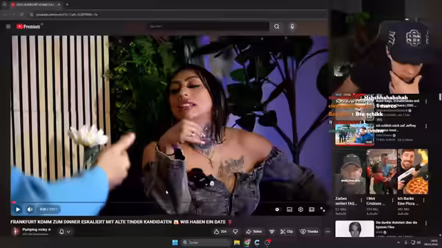 00:37:49Nach einer langen Diskussion über die anhaltenden technischen Probleme und die geplante Reise nach Dubai, beginnt die eigentliche Content-Produktion. Der Streamer reagiert auf das angekündigte Video "Frankfurt kommt zum Dinner, eskaliert mit alten Tinder-Kandidaten". Er kommentiert die Teilnehmenden, darunter eine 24-Jährige Türkin, die explizit nach einem Mann mit "geilem BBC" sucht, und einen deutlich älteren, alkoholisierten Bewerber. Der Clip wird als "tot" und unattraktiv eingestuft, was die Laune des Streamers senkt.