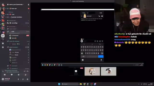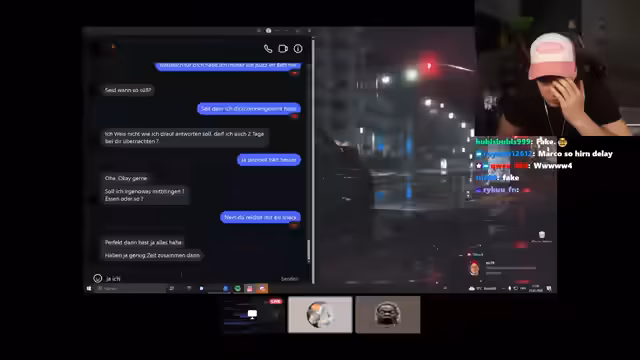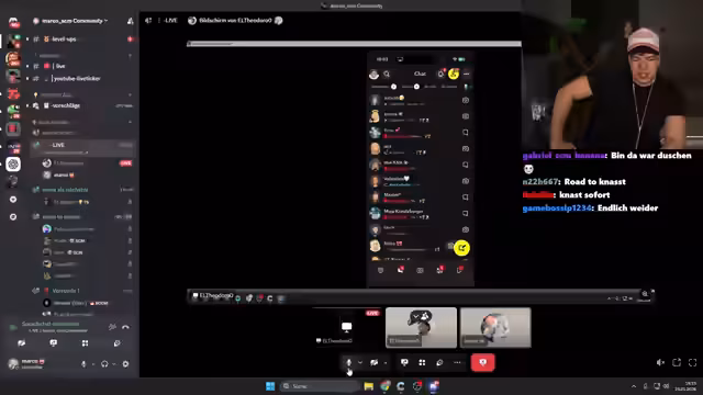 01:52:36Der Stream schlägt plötzlich in puren Horror um. Theo meldet, dass es zu Hause an der Türklingel läutet und eine fremde Stimme nach Marco ruft. Marco geht sofort davon aus, dass es sich um einen Einbruch handelt. Seine Panik steigt, da er sich für Theos Sicherheit verantwortlich fühlt und befürchtet, dass Theo in Gefahr ist. Der Chat ist gleichermaßen besorgt und ratlos. Marco beschließt, die Situation ernst zu nehmen und ruft Theo zur Vorsicht, auch über die Grenzen des Streams hinaus.