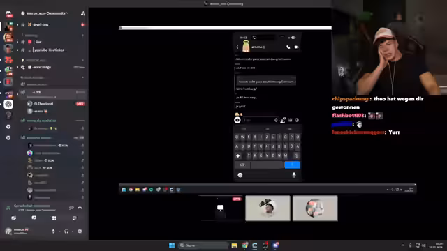 01:31:21Das zwischenmenschliche Desaster erreicht einen Höhepunkt, als eine andere Frau im Chat behauptet, Theo wegen des Veröffentlichens privater Bilder anzeigen zu wollen. Gleichzeitig gibt es technische Probleme mit Theo, der plötzlich offline geht und nicht mehr zu hören ist. Marco und der Chat geraten in Panik, da sie für Theos Sicherheit besorgt sind und die Lage ernst nehmen. Es werden Ideen gesammelt, wie man Theo erreichen und die Krise bewältigen kann, was zu einer Mischung aus Sorge und Spekulation führt.