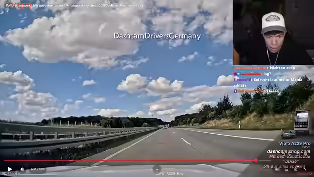 00:55:45Da der Loyalitätstest entfällt, widmet sich der Streamer einer Dashcam-Reaktion. Er kommentiert diverse Verkehrsvorfälle, kritisiert rücksichtsloses Verhalten im Straßenverkehr, wie das unerlaubte Überholen oder Behinderung anderer Fahrer, und erzählt eine persönliche Anekdote über einen Vorfall mit einem E-Scooter auf einer Klassenfahrt in Berlin.