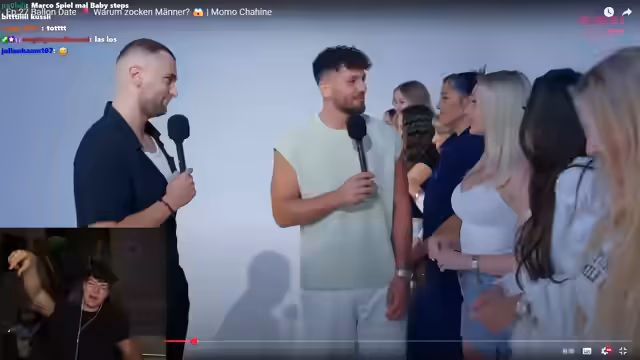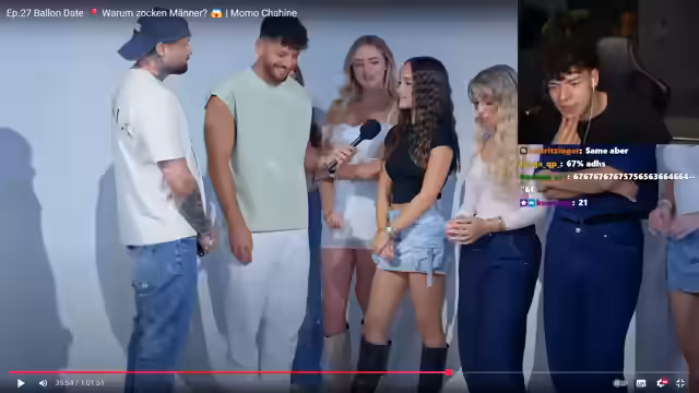 01:09:40Zu Beginn des Formats diskutieren der Streamer und das Publikum intensiv über das Alter der männlichen Kandidaten. Ein Teilnehmer, der zunächst für 23 gehalten wurde, gibt tatsächlich 32 Jahre an, was für große Verwirrung und Diskussionen über sein Aussehen sorgt. Ein anderer Kandidat, Daniel (26), stellt sich mit einem selbstbewussten Auftreten vor, das der Streamer als positiv bewertet, obwohl der Altersunterschied zu manchen Frauen im Publikum thematisiert wird. Die erste weibliche Teilnehmerin, Marcella (22), stößt auf positive Resonanz, lehnt den Ballon jedoch später aufgrund der großen Entfernung nach Mannheim ab.