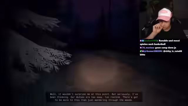 04:59:07Marco trifft im Spiel auf andere Charaktere, darunter einen neuen Ranger namens Frank und ein Paar, das im Wald umherwandert. Die Begegnungen sind gespenstisch und wirken angespannt. Es tauchen vermehrt Hinweise auf paranormale Aktivitäten auf, wie z.B. UFO-Sichtungen und unheimliche Lichter. Der Stream endet mit einem Cliffhanger, als Marco merkt, dass er sich erneut verlaufen hat und der Wald immer noch voller ungelöster Geheimnisse ist.
