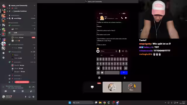 02:02:42Die Streamer tauschen mit einem 16-jährigen Mädchen Nachrichten aus, wobei sie verschiedene Formulierungen testen, um zu sehen, ob sie eine positive Reaktion erhalten. Es werden Screenshots geteilt und ein Treffen diskutiert. Das Mädchen scheint interessiert, aber auch etwas zögerlich, da sie häufig aus dem Chat heraus- und wieder hereinkommt. Die Streamer planen, sie mit einem 'Netflix-Vorschlag' oder einem 'W'-Ankündigung zu konfrontieren, um ihre Reaktion zu testen.
