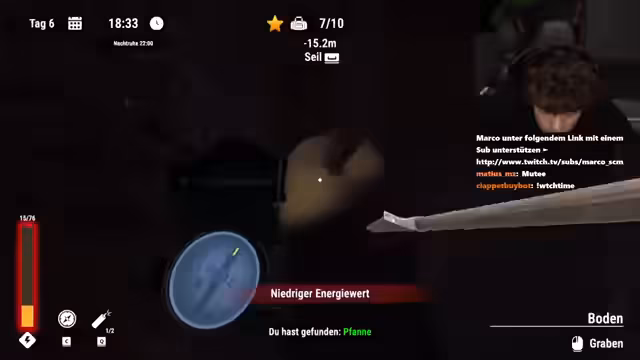 02:01:38Es müssen noch sechs Items gefunden werden, bevor die Wache kommt. Es werden Streichhölzer, ein Schraubenschlüssel und Stiefel gefunden. Der Kauf von Dynamit wird in Betracht gezogen, aber zunächst verworfen. Es wird festgestellt, dass noch 50 Follower bis zu 200.000 fehlen. Der Streamer muss sich beeilen, da die Zeit knapp wird. Schließlich wird die Pfanne gefunden. Es wird überlegt, ob man die Teemaschine kaufen soll, um zusätzliche Energie zu erhalten. Es wird daran erinnert, in der nächsten Mittagspause um Geld zu spielen. Der Boden wird in 15 Metern Tiefe erreicht, was die Hoffnung auf eine baldige Flucht weckt. Unten werden noch Items gesammelt, bevor es zur Nachtruhe geht. Es wird festgestellt, dass bisher kein Fehler im Hardcore-Modus gemacht wurde, was die Frage aufwirft, was daran eigentlich 'Hardcore' ist.