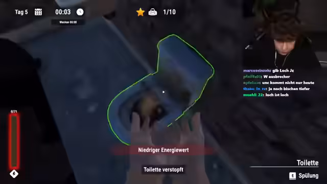 01:51:02Es wird überlegt, einen Schlafstream im Rahmen des 24-Stunden-Streams zu veranstalten. Es wird angekündigt, dass bald ein 24-Stunden-Stream und irgendwann ein Submarathon stattfinden werden. Es wird ironisch gefragt, zu wem man geht, wenn die Polizei einen bedroht. Es folgt eine kurze Mittagspause mit Liegestützen. Es wird ein Schraubenzieher für ein Item benötigt. Es wird trainiert, um eines Tages die Baddie hochheben zu können. Es wird um Toilettenpapier oder Money gespielt, wobei Toilettenpapier gewählt wird. Es wird im Spiel um Toilettenpapier gezockt und verloren. Es wird die Seife aufgehoben, obwohl der Chat dies schon mehrfach empfohlen hat.