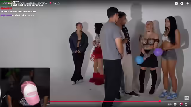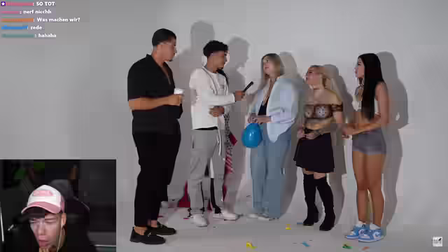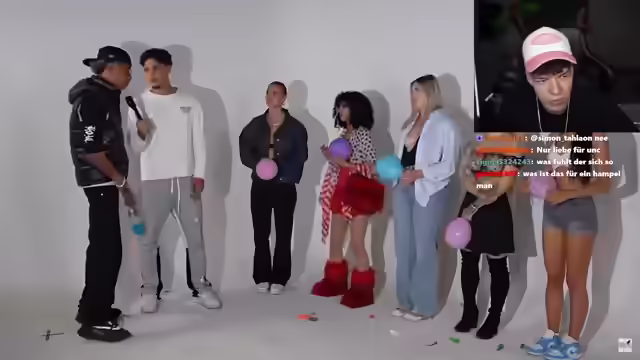 00:32:55Der Stream wechselt zu einer 'Pop de Balloon'-Session, einer Art Dating-Spiel. Kandidatinnen stellen sich vor, darunter eine selbstständige Reisende, eine Köchin und eine Influencerin. Ein Kandidat namens Leonard wird vorgestellt, der eine der Kandidatinnen aufgrund ihrer Locken auswählt. Die Kandidatinnen geben Gründe an, warum sie den Ballon des Kandidaten platzen lassen, meist aufgrund von Größe oder Typ. Ein weiterer Kandidat, Rafa, wird vorgestellt, der rappt. Die Kandidatinnen lassen auch seinen Ballon platzen, weil sie seinen Rap nicht überzeugend finden. Es folgt die Ankündigung des Check-ups für 'Zwei Lügen, eine Wahrheit'. Ein weiterer Kandidat, Jörg, ein Fashion Content Creator, wird vorgestellt. Die Kandidatinnen lassen seinen Ballon platzen, weil er zu 'teak' sei und eine Flasche mit sich herumträgt. Ein Kandidat namens Kevin wird vorgestellt, der Tattoos hat. Die Kandidatinnen lassen seinen Ballon platzen, weil sie seine Tattoos nicht mögen und er nicht ihr Typ ist.