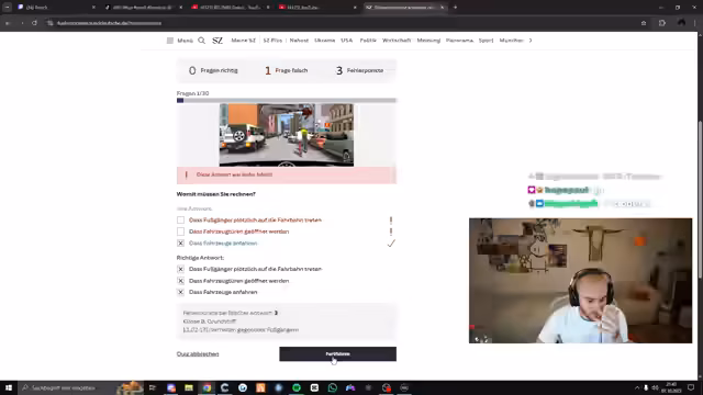03:33:39Nachdem der Streamer bereits 60 Fehlerpunkte im Führerscheintest gesammelt hat, geht es weiter mit unlogischen Fragen, wie zum Beispiel, was man tun soll, wenn man unmittelbar nach einem Streit wütend losfahren möchte. Er beschreibt die Fragen als unnormale Fotzen und pädagogisch, bevor er das Quiz frustriert beendet.