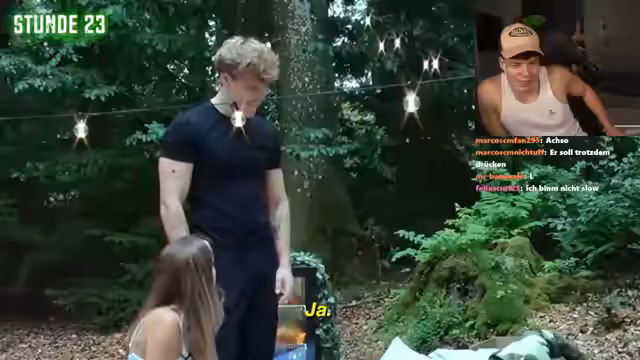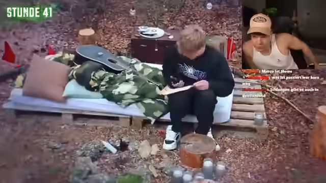 00:41:40Der Fokus liegt auf der Reaktion auf ein Video, das einem Format ähnlich wie '7 vs. Wild' entspricht. Dabei müssen Teilnehmende in einer Waldumgebung diverse Challenges bestehen, um gemeinsam zu überleben oder Belohnungen zu sichern. Es werden konkrete Szenen aus dem Video gezeigt, wie etwa das Sammeln von Wasserballons, das Knacken einer mysteriösen Kiste, das Feuermachen und das gegenseitige Bewerten in einer 'Beste-Schwiegersohn'-Rangliste. Die mit einem potenziellen Projekt 'Laser Luca' verbundenen Hoffnungen auf hohe Zuschauerzahlen werden besprochen. Abschließend werden konkrete Pläne für die nächste Woche mit einem extrem vollen Content-Loadout konkretisiert.
