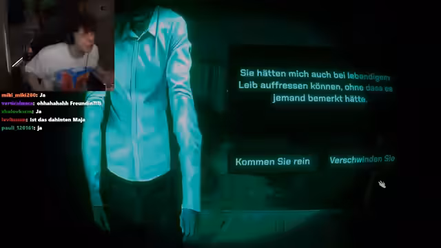 02:29:51Der Streamer beginnt damit, über ein Spiel zu sprechen, in dem Bier scheinbar die Lösung für alles ist. Er interagiert mit dem Chat und entscheidet, ein Bier zu trinken. Plötzlich klopft es an der Tür, und der Streamer wird unruhig. Er fragt, wer da ist, und spekuliert darüber, ob es Besucher sind. Der Chat ist aktiv an der Diskussion beteiligt, und der Streamer überlegt, ob er die Personen reinlassen soll oder nicht. Er erwähnt, dass er Angst im Dunkeln hat, aber derzeit nichts scheint, wovor er sich fürchten müsste.