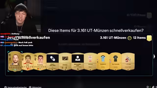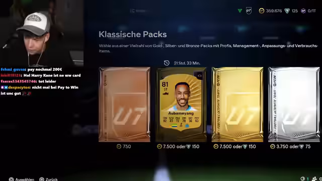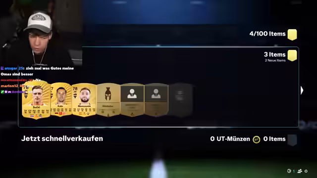 00:39:55Nachdem die ersten FIFA Points aufgebraucht sind, lädt der Streamer weitere 300 Euro auf, um die Pack Opening-Session fortzusetzen. Er ist frustriert, dass er trotz des hohen Einsatzes bisher nur wenige gute Spieler gezogen hat. Der Chat gibt Tipps, welche Packs er öffnen soll und wann es sich lohnt, Spieler zu behalten oder zu verkaufen. Es kommt zu einigen Fehlern, bei denen der Streamer versehentlich gute Spieler verkauft oder schlechte Spieler behält. Trotz der Frustration und des hohen finanziellen Aufwands bleibt er motiviert und hofft weiterhin auf bessere Ergebnisse. Er vergleicht das Pack Opening mit Glücksspiel und äußert sich besorgt über die Höhe seiner Ausgaben. Zwischendurch laufen im Hintergrund Songs von 187, was zu Diskussionen im Chat führt.