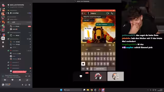 03:36:13Mit steigender Zuversicht werden flirtanere und 'freaky' Nachrichtenvorschläge im Chat ausgetauscht. Ideen wie 'Nimm ich mir ein Ticket mit' oder 'Ich stehe auf Überraschungen' werden diskutiert. Die Strategie zielt darauf ab, die Reaktion des Mädchens auf spielerische und suggestive Aussagen zu testen. Überraschenderweise reagiert die positiv und schickt sogar ein Herz-Emoji, was den Streamer und den Chat sehr erfreut und zuversichtlich stimmt.