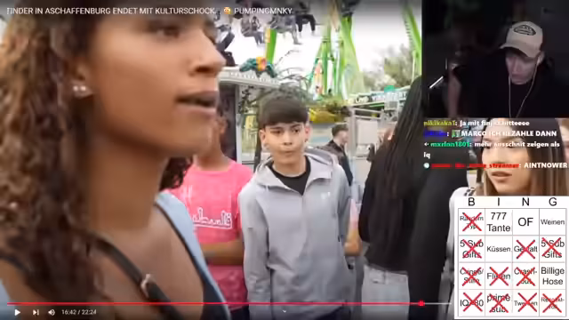 01:00:10Das Highlight des Streams ist das wiederholte "Frankfurt-Tinder"-Bingo. Der Streamer präsentiert mehrere Clips von Dates und analysiert die Kandidaten anhand der Bingo-Kriterien wie "Cringe", "Flirten" oder "IQ unter 80". Der Stream ist geprägt von humorvollen, aber auch schockierenden Kommentaren der Dates und der Reaktionen des Streamers, was zu mehreren Bingos und einer unterhaltsamen, aber anstrengenden Session führt.
