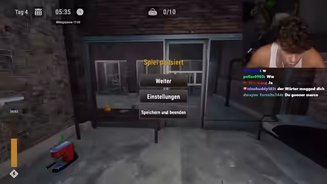 03:17:48Der Streamer startet das Spiel 'Prisoner Escape Simulator' im neuen, schwierigeren 'Hardcore-Modus'. Diesmal wird er aus einem Hochsicherheitsgefängnis entkommen müssen. Die anfänglichen Voraussetzungen sind desaströs: Er beginnt nur mit einem Holzeisstiel, hat sehr wenig Energie und die Wachen reagieren schneller. Der zentrale Plan, ein Loch zu graben, gestaltet sich von Anfang an extrem herausfordernd.