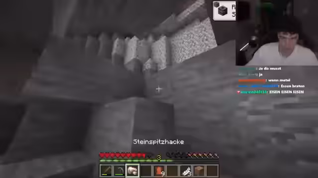 04:08:40Der Streamer findet Brot in jeder Kiste und weiß nicht, wo er hin soll. Der Streamer ist auf Höhe -29 und muss tiefer. Der Streamer findet Fackeln. Der Streamer findet mehr Diamanten. Der Streamer geht raus und wieder rein. Der Streamer ist auf Höhe -41 und findet keine Diamanten. Der Streamer wird von einem Creeper gekillt. Der Streamer geht wieder ins Mindshift und findet Dias. Der Streamer hat 14 Diamanten. Der Streamer will nie wieder in eine Höhle gehen. Der Streamer ist auf Höhe -40 und findet eine Kettenrüstung, eine Schallplatte, einen goldenen Apfel, Knochen, einen Eimer und einen Sattel. Der Streamer braucht Essen und brät Essen. Der Streamer findet Dias und wird von Spinnen angegriffen. Der Streamer will 30 Diamanten holen und geht raus.
