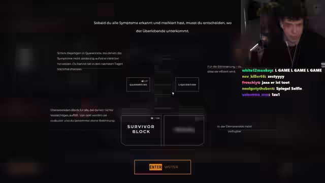 02:30:14Die Untersuchungen werden fortgesetzt, wobei wiederholt Symptome wie blaue Flecken und Husten festgestellt und im Chat diskutiert werden. Streamer muss mitunter unklaren Fällen umgehen, wie einer Dame, die behauptet, gebissen worden zu sein, obwohl keine Bisswunde gefunden wird. Diese Situation führt zu einer Diskussion, ob vorsorglich in die Quarantäne geschickt werden soll, da das Wort des Überlebenden nicht uneingeschränkt geglaubt wird.