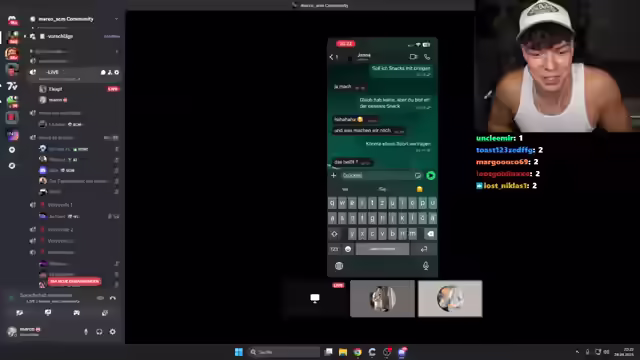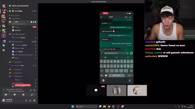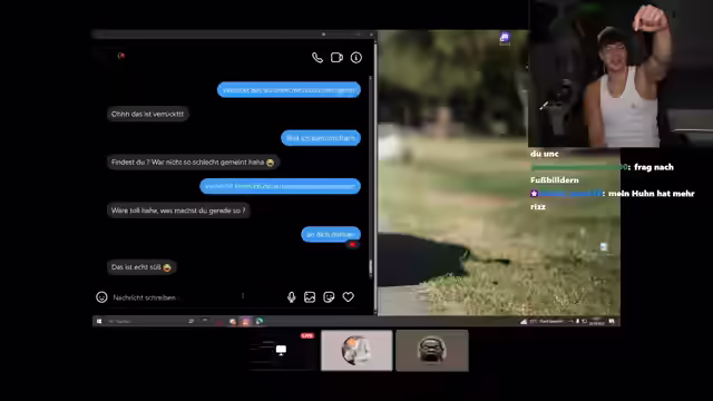 01:57:55Kevin, der nächste Anrufer, sucht eine Freundin. Er hat eine gewisse Lena im Auge, die er vor vier Monaten in der Stadt kennengelernt hat. Sie hat ihn nach seinem Snapchat gefragt. Kevin ist 16 und Lena ist 14 Jahre alt. Der Streamer fordert ihn auf, die Übertragung zu starten. Kevin gibt an, dass er Lena zuletzt geschrieben hat, dass er kurz Haare waschen geht, und einen 'verrückten Smiley' hinzugefügt hat. Der Streamer schlägt vor, ihr zu schreiben, dass es verrückt sei, ohne ihn duschen zu gehen. Der Chat ist geteilter Meinung, ob dies eine gute Idee ist, aber Kevin entscheidet sich, es zu tun. Sie antwortet mit 'Oh, das ist verrückt'. Der Streamer schlägt vor, zu schreiben, dass er es ziemlich frech findet, um ihren Vibe zu checken.