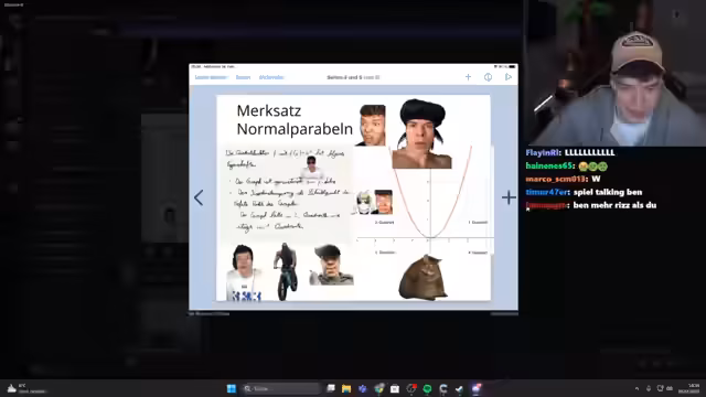 00:37:53Marco reagiert auf verschiedene Inhalte, die ihm im Chat oder auf Discord geschickt werden. Er beantwortet Quizfragen zur Serieserien wie 'Breaking Bad' und 'Prison Break'. Er zeigt sich verwirrt über eine Szene in 'Prison Break' und vergleicht Schauspieler zwischen den Serien. Marco bewertet sein eigenes Auftreten und seine Fähigkeiten in verschiedenen Dingen wie DSDS oder in GeoGuessr-Spielen oft humorvoll und selbstironisch. Er ist erstaunt über die geografischen Fähigkeiten oder Fehleinschätzungen bei seinen GeoGuessr-Runden.