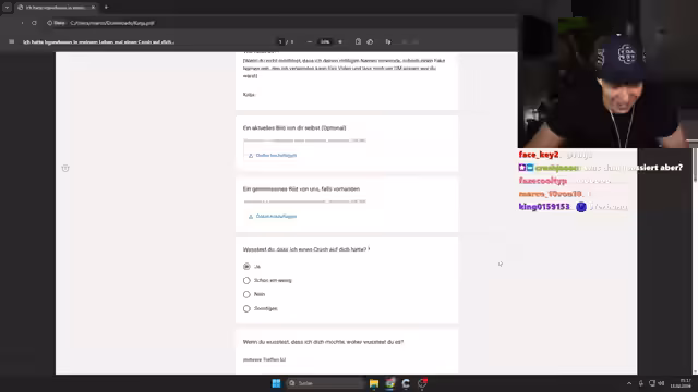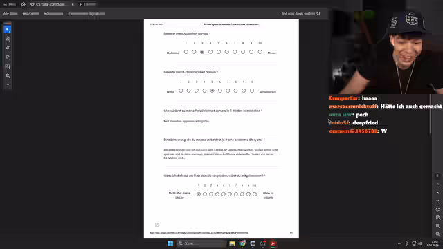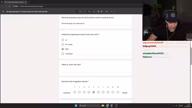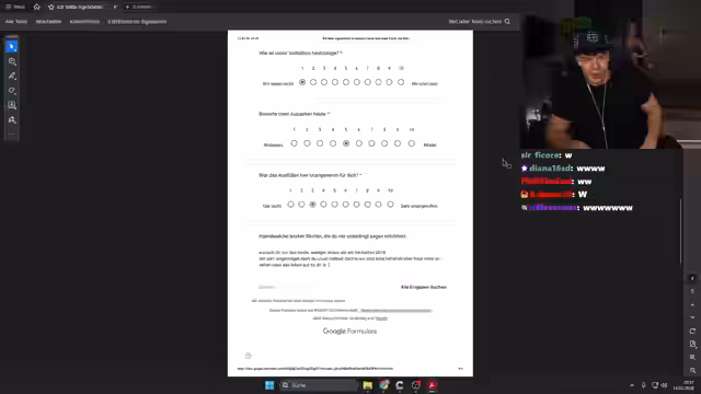03:29:05Der Streamer präsentiert ein Formular, das er an ehemalige Crushes geschickt hat, um herauszufinden, ob sie auch Gefühle für ihn hatten. Die Antworten sind durchwachsen. Eine ehemalige Crush gibt ihm eine 5 für sein Aussehen und eine 9 für seine Persönlichkeit, was ihm unangenehm ist. Eine andere Person behauptet, die 'erdrückende Beweislage' für seine Zuneigung nicht bemerkt zu haben.