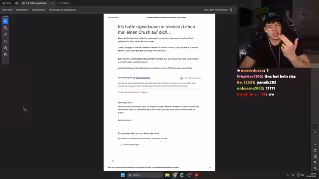 02:43:46Der Streamer kündigt an, dass er ehemalige Crushes angeschrieben habe und deren Antworten auf ein von ihm erstelltes Formular vorstellen wird. Das Ziel ist, die Beantwortung der Frage, ob sie seinerzeit auch einen Crush auf ihn hatten. Er betont, dass dies unangenehm für ihn sein könnte und den Chat auffordert, ihn bei der Präsentation der Antworten zu unterstützen. Die Stimmung ist gespannt und humorvoll.