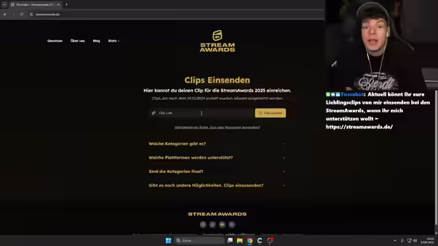 00:15:59Es wird ein dringender Aufruf an die Community gestartet, sich bei den Stream Awards unter "Ausrufezeichen SA" einzuloggen und für den Streamer als "Newcomer des Jahres" zu stimmen. Der Streamer betont, dass er und die Community gemeinsam das Streaming-Projekt aufgebaut haben und große Erfolge erzielt wurden, wie das Erreichen von 100.000 und später 200.000 Followern sowie das Sammeln von YouTube-Abonnenten. Er findet, er habe es verdient, Newcomer des Jahres zu werden, da er Anfang des Jahres noch deutlich weniger Zuschauer und Abonnenten hatte. Die Community wird gebeten, sich auf der Seite einzuloggen, zum Bereich "Stattdessen ein Event, Duo Newcomer wählen" zu gehen, "Bester Newcomer" auszuwählen, den Kanal "Marco-SCM" zu suchen und eine Begründung für die Nominierung abzugeben. Zusätzlich werden die Zuschauer ermutigt, ihre Lieblingsclips des Streamers einzusenden, um möglicherweise in anderen Kategorien nominiert zu werden. Der Streamer betont, dass ihm diese Auszeichnung sehr viel bedeuten würde und er sich riesig freuen würde, Newcomer des Jahres zu werden, da dies eine Anerkennung für die gemeinsame Arbeit wäre. Er kündigt an, den Aufruf in den nächsten Wochen noch oft zu wiederholen.