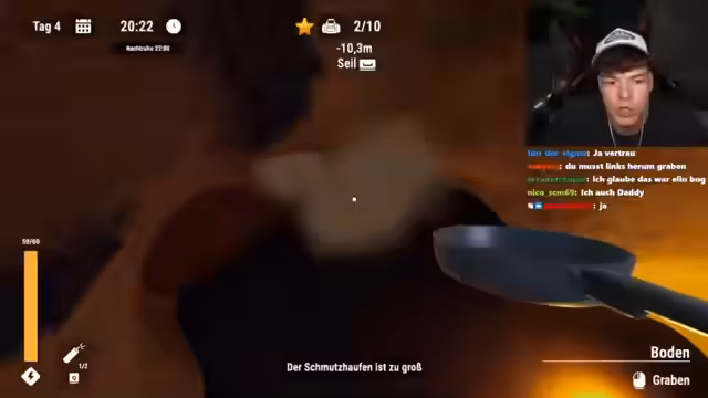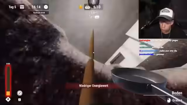 02:36:13Die Hauptaktivität des Streams ist ein Escape-Spiel, in dem der Streamer versuchen muss, aus einem Gefängnis zu entkommen. Er konzentriert sich darauf, nach unten zu graben, um einen Sarg zu finden, der einen Schlüssel enthält. Das Spiel wird von wiederholten Rückschlägen geprägt: er verliert Items wie die Pfanne und die Feldflasche, hat ständig mit Energiemangel zu kämpfen und wird von Wachen unterbrochen. Die Strategie, einen Kompass zu nutzen, erweist sich als frustrierend und unzuverlässig.