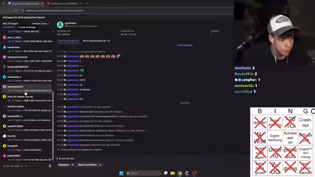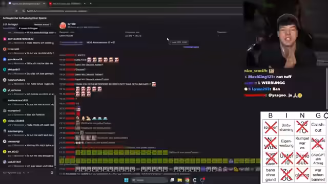 01:19:17Der Streamer startet eine interaktive Runde „Bingo“ mit seinen Zuschauern, die häufige Gründe für Banns aus der Community anspricht. Kategorien wie „Bann ohne Grund“, „Spammen“, „falsche Rechtschreibung“ oder „Beleidigung“ werden erläutert und diskutiert. Die Beteiligung der Zuschauer ist dabei entscheidend, um das Bingofeld zu vervollständigen. Dies schafft eine unterhaltsame Möglichkeit, mit den Gründen für Chat-Sperren umzugehen und die Community einzubeziehen.