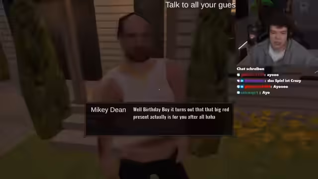 04:00:11Der finale Höhepunkt des Spiels ist ein Kampf gegen den Magier, der sich als alter Widersacher herausstellt. Nach einer aufreibenden Konfrontation, in der der Streamer sein Leben schützt, wird der Kampf durch das Eingreifen der Partygäste beendet. Der Magier gibt daraufhin die Illusion auf und offenbart, dass der ganze Konflikt nur eine letzte, besonders dramatische Unterhaltung war, um die Party in Gang zu bringen. Der Streamer kann nun aufatmen und genießen, wie sich alle seine Freunde für ihn ins Zeug gelegt haben und die Feier nun wirklich im vollen Gange ist.