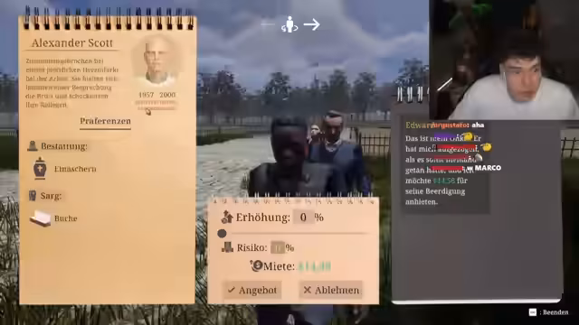02:26:41Nach der ersten Bestattung trifft der Streamer auf einen Kunden, der einen Schuss benötigt. Es werden Blumen für ein Grab gekauft und Wildkräuter gepflückt, um diese anschließend zu gießen. Nach dem Tutorial wird der Exorzismusraum entdeckt und es wird überlegt, was zu tun ist, wenn eine Leiche besessen ist. Ein neuer Kunde, Thomas, möchte seinen verstorbenen Freund Oliver beerdigen lassen, der bei dem Versuch, Habseligkeiten aus einer brennenden Scheune zu retten, ums Leben kam. Es wird über den Preis verhandelt, wobei der Streamer versucht, mehr Geld herauszuholen. Der Streamer äußert seinen Unmut über den Job und betont die Notwendigkeit, seriös zu bleiben. Ein weiterer Kunde wird eingelagert, während über den Kauf eines Eichensargs nachgedacht wird. Der Streamer entscheidet sich, Leichen nicht mehr in der Kühlung zu lagern, da er den Raum für besessen hält und beerdigt eine Leiche kurzerhand draußen. Ein weiterer Kunde verlangt eine Einäscherung, was den Streamer vor ein Problem stellt, da er den verfluchten Raum betreten muss.
