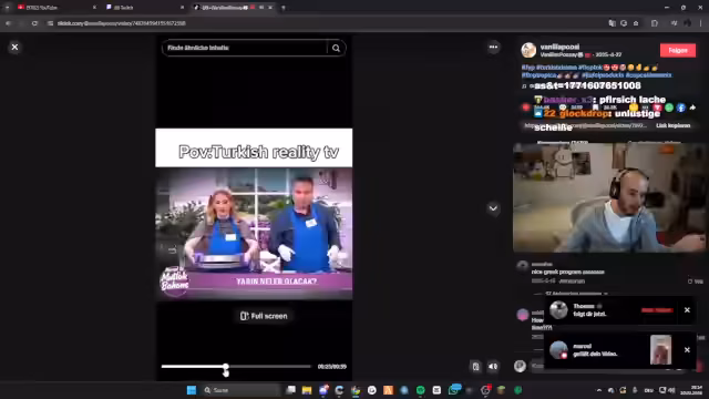 00:10:25Der Fokus verschiebt sich auf türkische Serien, deren Inhalt und剪辑 (Clipping) sie als 'unnormal schlecht' und auf 'Clipfarm' basierend beschreibt. Sie ist fasziniert von einem spezifischen Clip-Trend, bei dem Personen Essen fallen lassen oder übertrieben reagieren, und bittet den Chat aktiv um Hilfe bei der Identifikation der genannten Serie. Sie wiederholt diese Bitte mehrfach und zeigt, wie sehr sie von diesem Phänomen eingenommen ist.