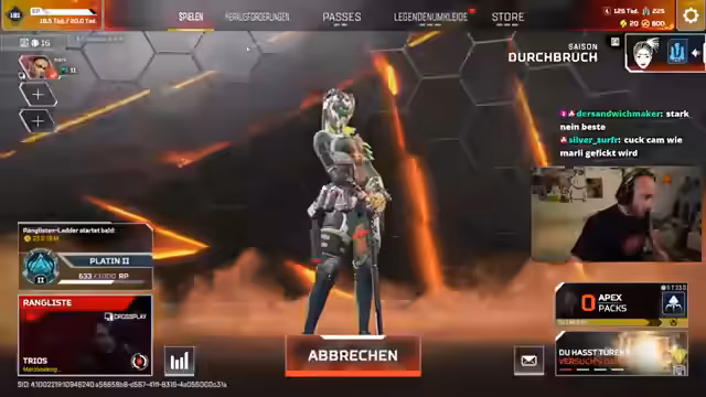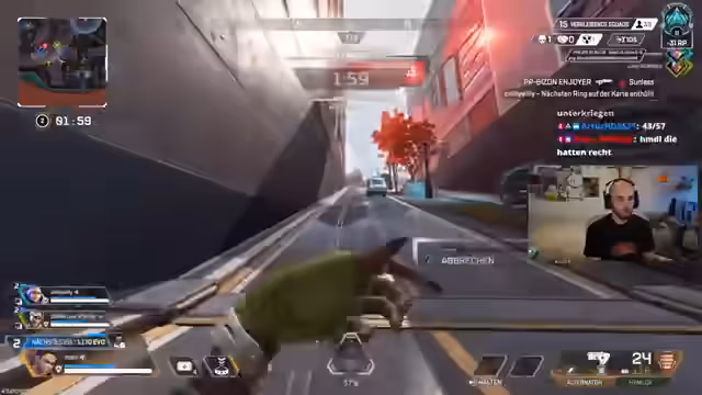 00:58:32Nach der Analyse der Dokumentation wechselt der Stream zu Apex Legends. Der Streamer startet das Spiel und plant, nur für kurze Zeit zu spielen, bevor ein weiterer Stream beginnt. Es werden verschiedene Wetten mit der Community abgeschlossen, wie zum Beispiel '4 Kills' in Ranked. Der Streamer zeigt sein Setup, einschließlich Maus, Tastatur und Controller, diskutiert über technische Aspekte und interagiert intensiv mit der Community während des Spielens. Dabei kommt es zu humorvollen Kommentaren und interaktiven Elementen, die das Spielerleben aufwerten.